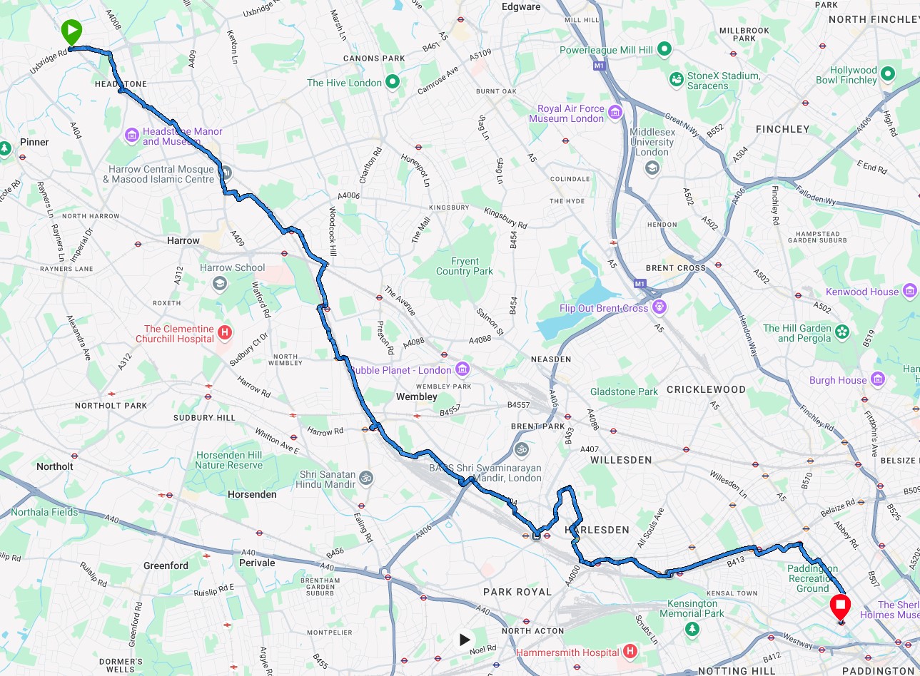 Harrow & Wealdstone, Kenton, South Kenton, North Wembley, Wembley Central, Stonebridge Park, Harlesden, Willesden Junction, Kensal Green, Queen’s Park, Kilburn Park, Maida Vale, Warwick Avenue