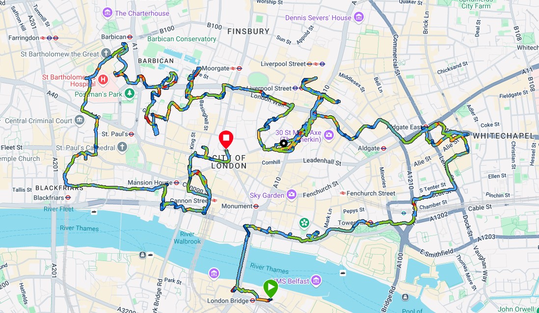 Due to a combination of GPS problems relating to tall buildings and incompetence my actual walk was longer than planned. Click on the map above to go to Garmin Connect to see where I backtracked 4 times to visit halls I missed the first time around.