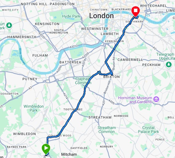 Morden, South Wimbledon, Colliers Wood, Tooting Broadway, Tooting Bec, Balham, Clapham South, Clapham Common, Clapham North, Stockwell, Oval, Kennington, Elephant & Castle, Borough, London Bridge