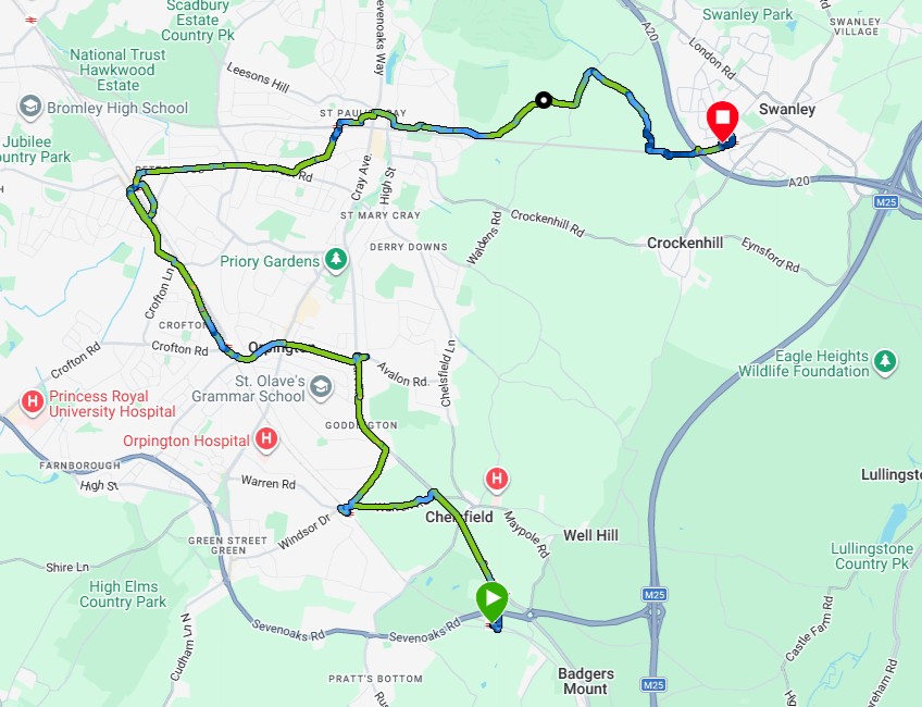 It was part sunny and 15C today but I didn’t feel the wind as I was walking mostly downwind. The route was about 75% on pavement and 25% in woodland or a stony path between St Pauls Cray and Swanley.
